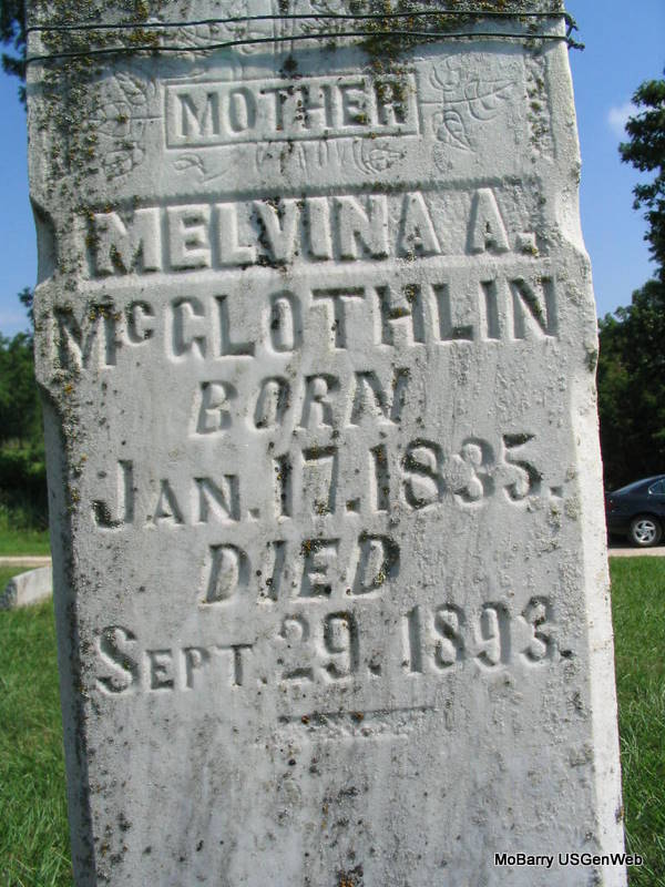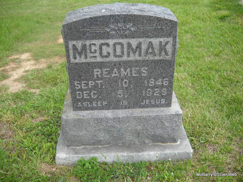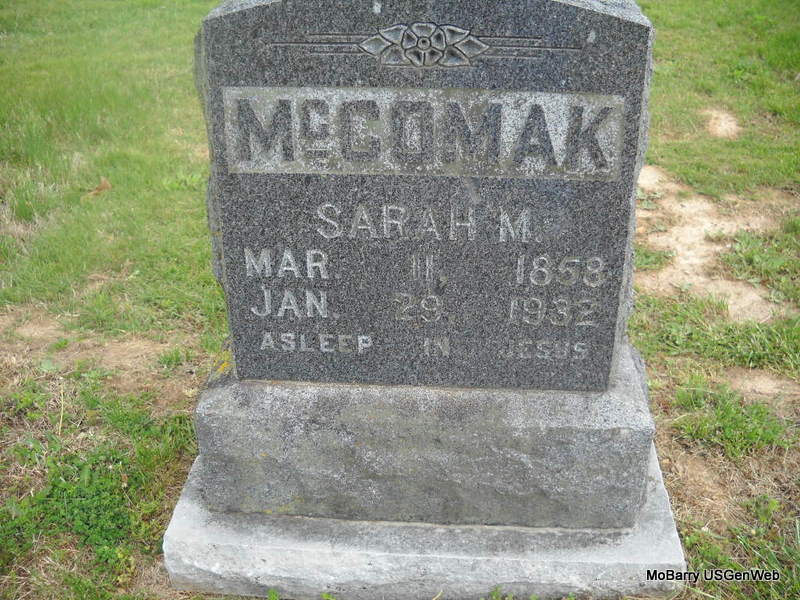 Research Note: Her stone reads McComak and 1932 as her death date. Her death certificate reads that her name was McCormick and that Reams McCormick was her husband. She was age 74 years, 10 months and 18 days old when she died. Her parents names are not given. Lon Stubblefield was the informant. Burial was in Washburn Prairie Jan. 30, 1933. - Daughter of James Roden and Mary Ann Miller. - Cassville Republican - 2 Feb 1933 - Mrs. R. McCormick Dies - Sarah Melvina Roden was born near where the city of Monett now stands on Mar. 11, 1858 and passed away at the home of her daughter, Mrs. Hattie Nodine near Washburn, Jan. 29. She was united in marriage to Reams McCormick on Feb. 6, 1876 and to this union two sons and four daughters were born. They are: Andrew McCormick of Bristol, CO; Harrison McCormick of Lama, Co; Mrs. Ida Gates, Mrs. Lillie Henry and Mrs. Hattie Nodine of Washburn. Mr. McCormick passed away in Dec. 1929. Thirty-two grandchildren and 15 great grandchildren also survive her. One half brother, J. W. Roden of Union, AR and one sister Mrs. Lizzie Layton of Independence, OR, also survive her. At the age of eighteen she professed faith in Christ and united with the Sugar Creek Baptist church and was a faithful member until death. Funeral services were held at the Nodine Home on Washburn Prairie, Jan. 30, conducted by Rev. J. T. Brattin and interment made in Washburn Prairie cemetery by the side of her husband under the direction of Blankenship Barr funeral service. | Photo Death Certificate Donna Cooper Newspapers.com Census Phyllis Long |