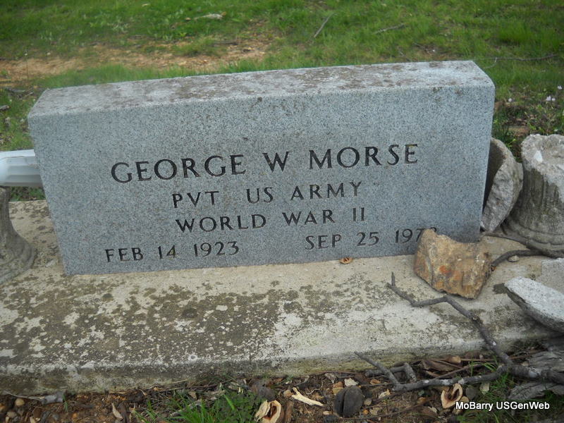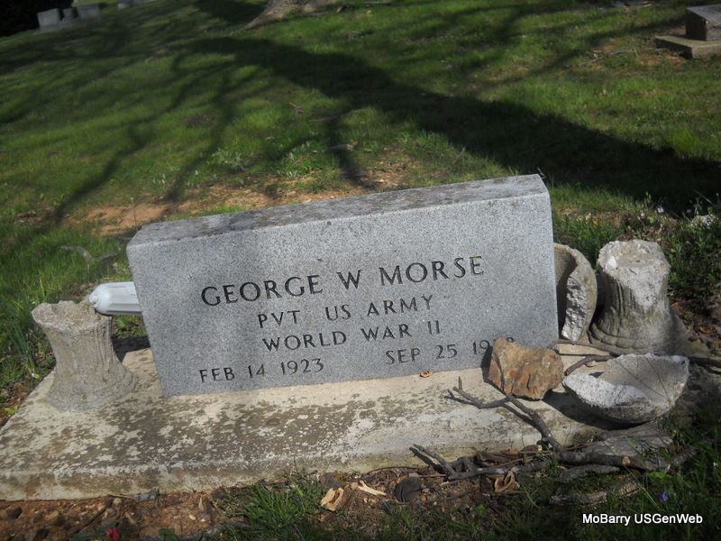 | MORSE, George W. | Feb. 14, 1923 | Sept. 25, 1978 | Inscription: "PVT US ARMY WORLD WAR II" - Research Note: Son of Jesse Lee Morse and Mary Adeline McCoy. - Washburn, Barry Co., MO resident. He was fatally injured in a one vehicle accident at 2 p.m. Monday near Washburn, had lived here the last eight years. He was a retired oil filed worker who had moved here from Bixby, OK. He was a veteran of WW II and a member of Disabled American Veterans and the Assembly of God. Survivors include his wife, Ella, three step-sons, five step-daughters; six brothers; four sisters and 18 grandchildren. - Another Photo | Newspapers.com Census Phyllis Long Photos Donna Cooper |