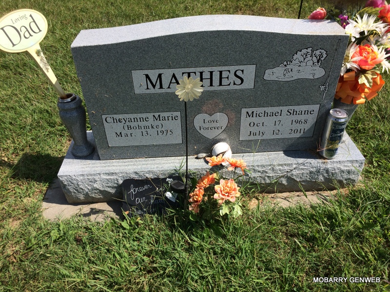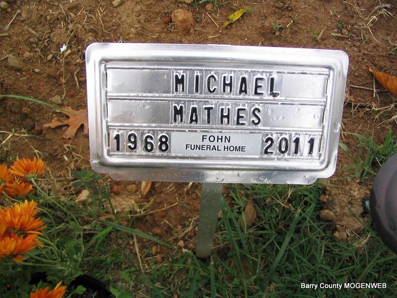 Research Note: He was the son of Floyd and Opal (Wendland) Mathes. Michael received his education in Centerville, Iowa, where he graduated from high school. Twenty years ago he moved from Exline, Iowa to Missouri to make his home. He was currently employed with American Farm Supply as an over the road truck driver. Survived by his wife, six sons and two daughters. Preceding him in death was his father, Floyd Mathes; one sister, Lorain Mathes; maternal grandparents, Harold and Mabel Wendland; paternal grandfather, Darwin McElderry and a great niece, Jayci Shrum. - Temporary Marker | Fohn Funeral Home Photo Phyllis Long |