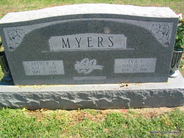 SSW: Iva L. - Inscription: "Jan. 16, 1932" - Research Note: Phyllis' Note - Father: Amos A. Myers; Mother: Eliza Jane Baker. Marriage: January 16, 1932 in Cassville, Barry Co., MO to Ivy Lillian Paul. Art worked on the railroad and was one of the foremans who helped build Roaring River State Park. Ivy was a homemaker and helped run the farm. She also helped with the election for years in Barry Co. Ivy and her sister Eva Walden ran a cafe in Washburn. | Family Group Sheet Sue Large Photo Phyllis Long |
