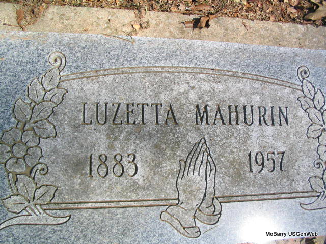 Research Note: Luzetta was a twin and her sisters name was Luletta born October 1880 (date wrong) to Winford L. Taylor and Mary M. Smith. Luzetta Married Marcus Layfette Mahurin June 6, 1897. They had four sons and two daughters. The death certificate has a birth date of Apr. 24, 1878 and death as May 19, 1958. The stone has 1883-1957. She had been at General Hospital No. 1 for 5 years. William Mahurin of Rayville, MO was the informant. | Family Records Jewel Mahurin Nead, Granddaughter Headstone Betty Fountain Erickson Death Certificate Photo Phyllis Long |