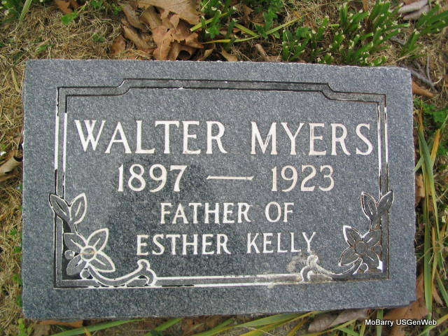 Inscription: "Father of Esther Kelly" - Research Note: He was the son of Amos A. Myers and Eliza Jane Baker. May 25, 1916, Cassville Republican, Barry Co., MO - Licenses to Wed: Walter Myers, Washburn & Clemmie Brewer, 17, Washburn. - 1920 Census, Missouri, Barry, Washburn, District 22 - Walter Myers, age 23, born AR, father born IA, mother MO; Clemma, wife, age 20, born MO, parents born MO; Ralph, son, age 2, born MO; Esther, daughter, age 9 months, born MO. | Headstone Sue Large Census Online Newspapers Photo Phyllis Long |