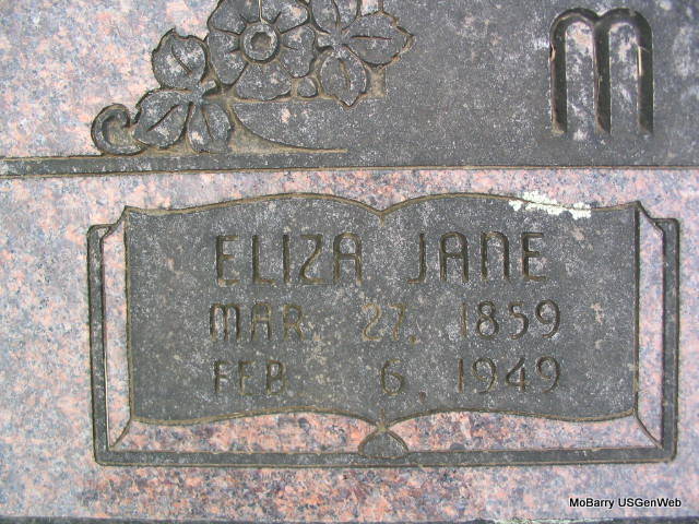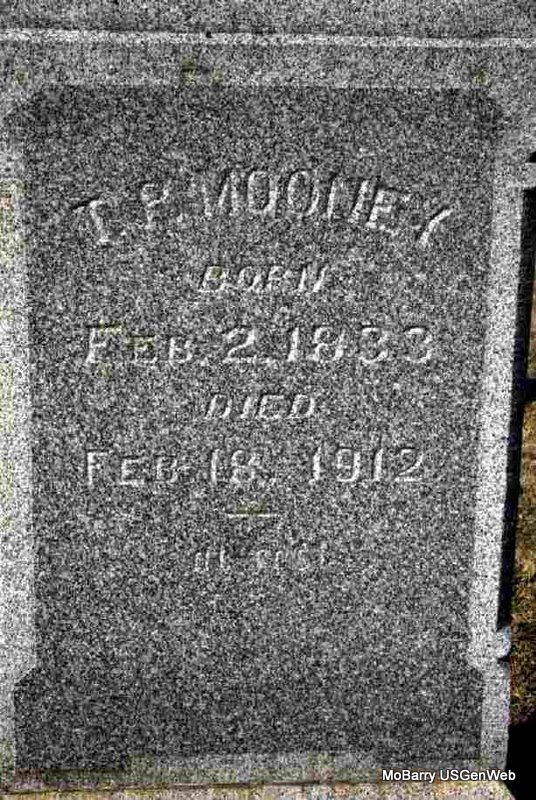 SSW: Eliza - Research Note: Timothy Patrick Mooney has a double marker with Eliza, his wife. They were married on Aug. 28, 1875 in Barry Co., MO. T. P. and Eliza were the adoptive parents of Jamie Mooney. - Cassville Republican, Feb. 22, 1912 - T. P. Mooney died at his home in Carthage Sunday and was buried at Washburn Monday. He was for many years a citizen of this county and a merchant at Washburn. He was a good business man and an excellent citizen. A few years ago he moved to Carthage where he has since made his home. J. H. Mooney, a business man at Washburn, is an adopted son of T. P. Mooney's. - Another Photo - Another Photo | Photo Family Online Obit Donna Cooper Photos Phyllis Long |