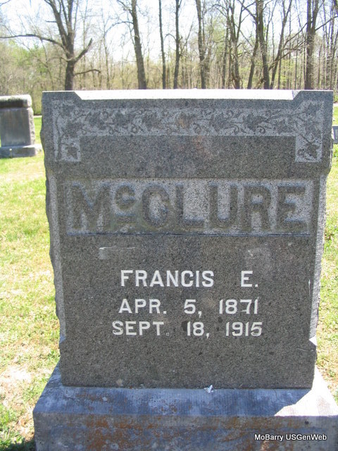 Research Note: He was a son of Thomas Jefferson McClure born TN and America Rowland, born TN. P. E. McClure was the informant on the death certificate. In 1910 Census, Exeter, Barry Co., MO, he is still living with his parents at age 38 and single. - Sept. 23, 1915, Cassville Republican, Barry Co., MO - "Bud" McClure Passes Away: Francis Ernest McClure, better known as "Bud" died at the home of his father, Thomas McClure, five miles southwest of Cassville on the Cassville and Washburn road, Sept. 18, 1915 , of paralysis. Mr. McClure was born April 5, 1871, being 44 years, 5 months and 13 days old. He was born on the farm where he had lived all of his life and on which he died. On account of his reserved disposition and fondness for home, he did not have a wide acquaintance but his friends were numbered by his acquaintance and he was a good citizen. He took a great interest in the home farm which is one of the best in this section of the county and always remained at home with his parents. He leaves an aged father, two brothers, J. P. of Purdy and Ewing, at home, and one sister, Mrs. Anna Arnold. Also one half brother, Emmett McClure and one half sister, Mrs. T. D. Pitts of Monett. | Online Obit Death Certificate Photo Phyllis Long |