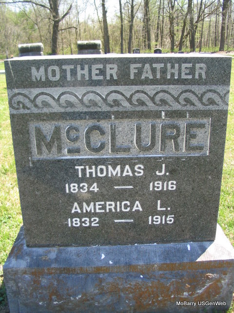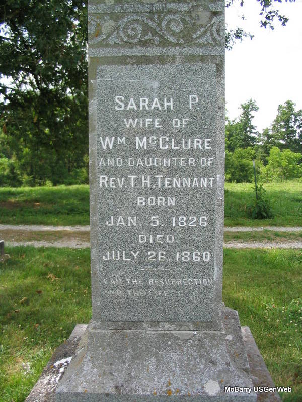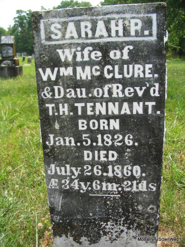 | MCCLURE, Sarah Pauline (TENNANT) | Jan. 5, 1826 | July 26, 1860 | Inscription: "Wife of William McClure and Dau. of Rev'd T. H. Tennant - Aged 34Y. 6 M. 21 D." - Research Note: William McClure married Sarah Pauline Tennant on Jan. 1, 1846 in Barry Co., MO. She was the first wife of William McClure born 1819. They had 3 children, one of whom was Rev. Walter T. McClure. - Newer Stone | Goodspeed's History MO Marriage Records Photos Phyllis Long |