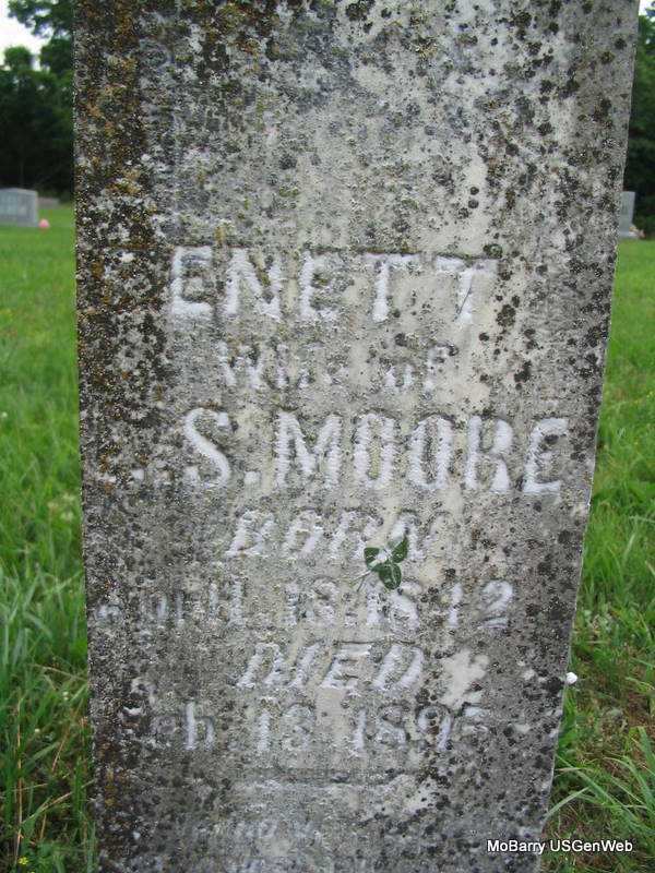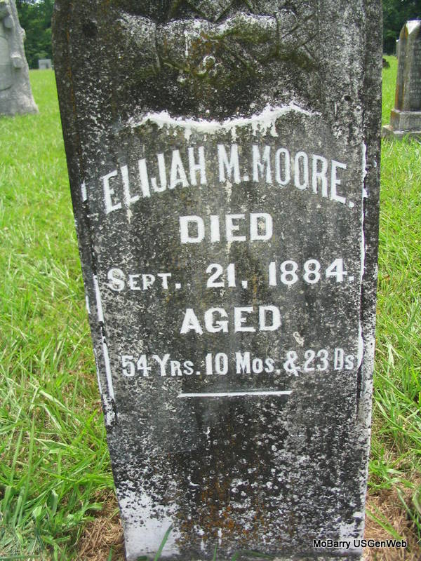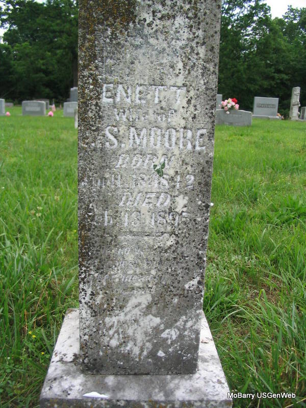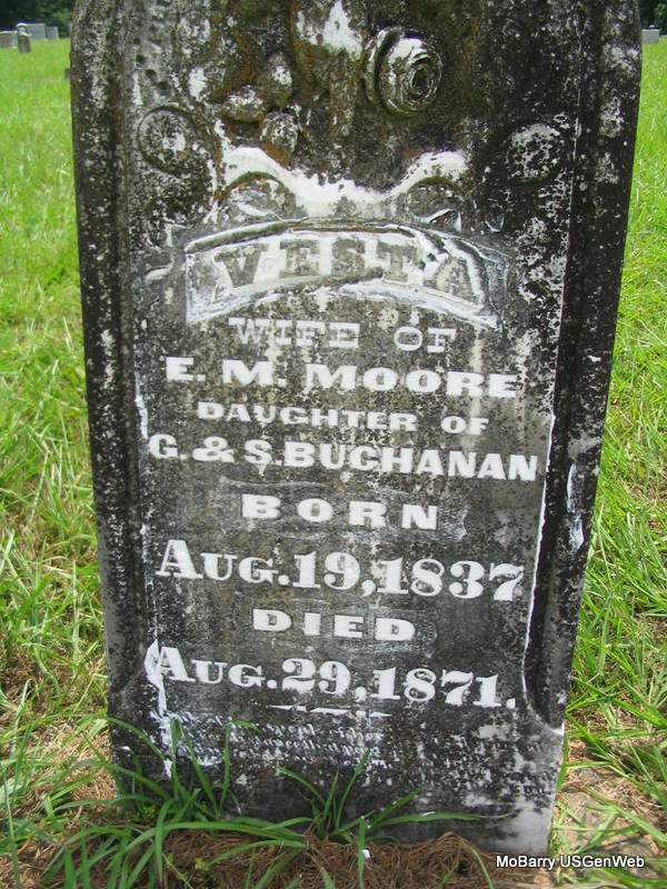 Inscription: "Aged 54 Yrs, 10 Mos. 23 Ds" - Research Note: He was the son of Garrett Leroy Moore and Ellen T. Truett both born TN. His wife was Vesta Buchanan, married on Oct. 14, 1855 in Barry Co., MO. - 1860 Census, Sugar Creek Twp., Barry Co., MO - E. M. Moore, 24, Merchandising, Tennessee; Vesta Moore, 23, Arkansas; W. G. Moore, 4, Missouri, Male; S. L. Moore, 2, Missouri, Male; Infant No Name Moore, 1 month, Missouri, Female. Living next door is his father: Garrett Moore, 56, Tennessee; Ellen T. Moore, 53, Tennessee; L. H. Moore, 21, Tennessee, Male; Simpson Moore, 19, Tennessee, Male; Mary E. Moore, 14, Tennessee, Female. | MO Marriage Records Census Photo Phyllis Long |