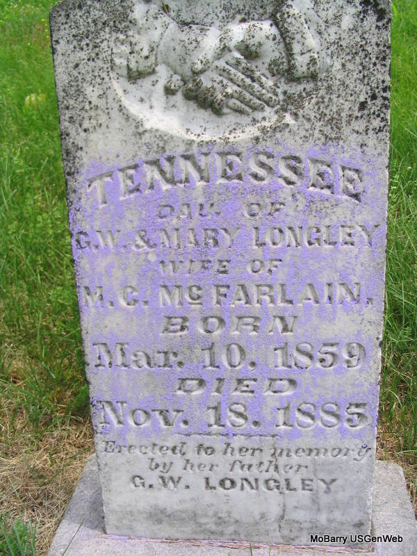Inscription: "Dau. of G. W. & Mary Longley - Wife of M. C. McFarlain" - Research Note: Tennessee Longley married Coonrod McFarlain/McFarland. Her parents were George Washington Longley and Mary Curd. She was listed on the census in 1860, 1870 and 1880 of Barry Co., MO. | Note Donna Cooper Photo Phyllis Long |