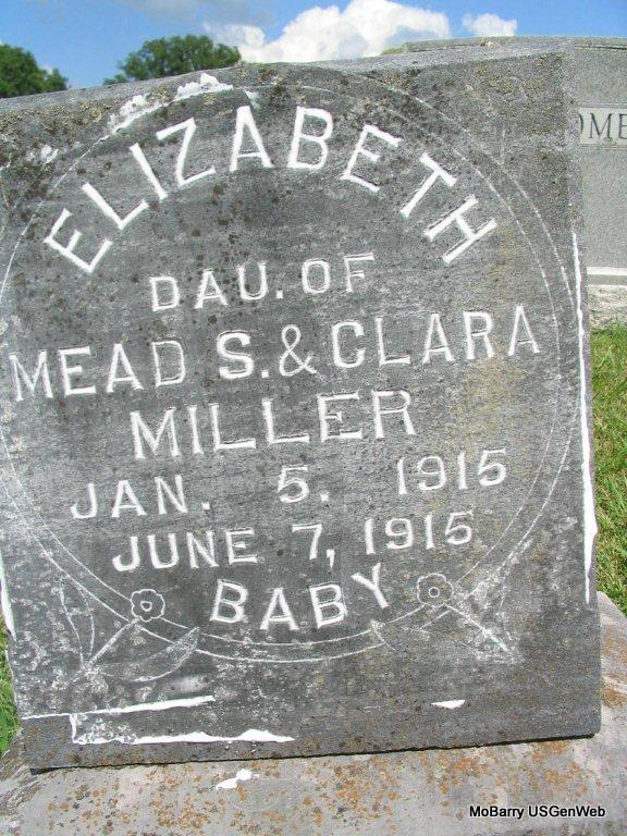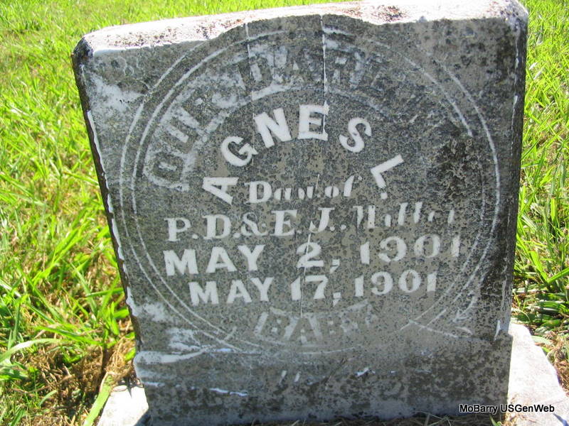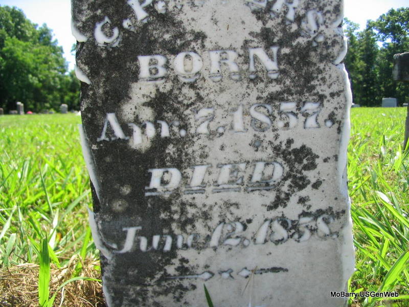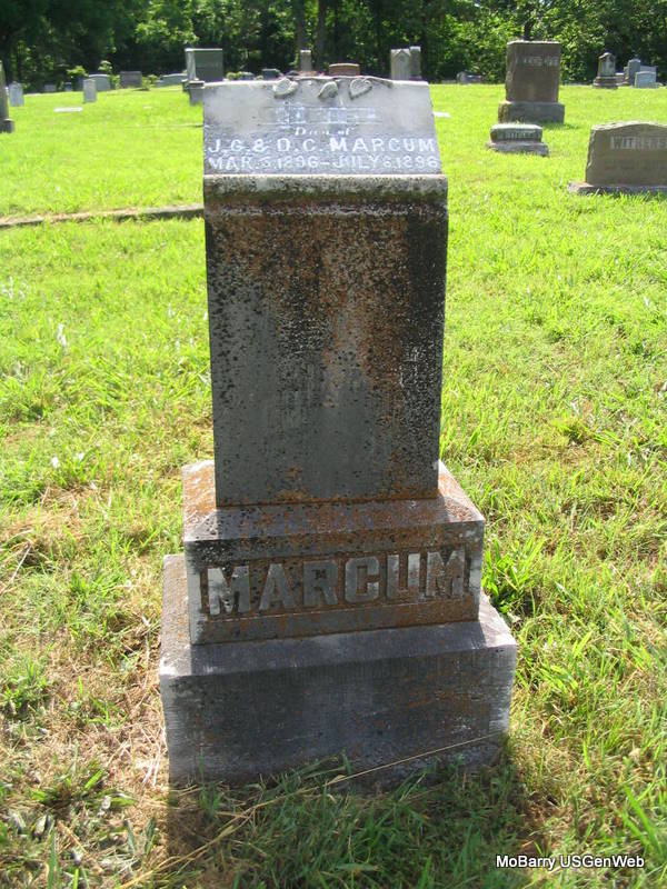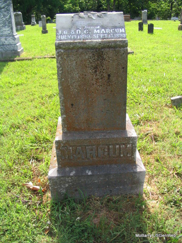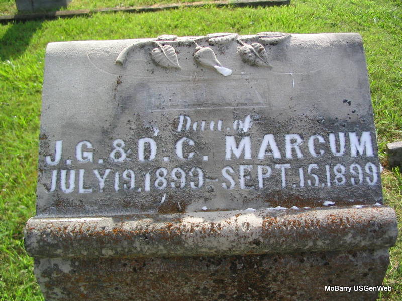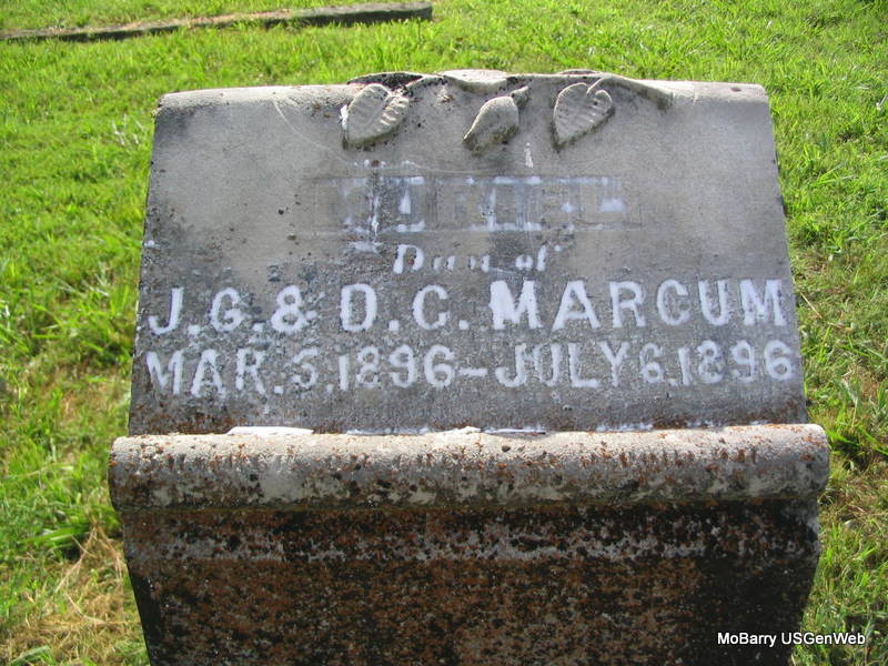 | MARCUM, Mona | July 19, 1899 | Sept. 15, 1899 | Inscription: "Dau. of J. G. & D. C." - Research Note: She was the daughter of James Granville Marcum and Demah Park. James and Demah moved to Joplin, MO and died there. - Another Photo - Another Photo | Online Newspapers Photos Phyllis Long |