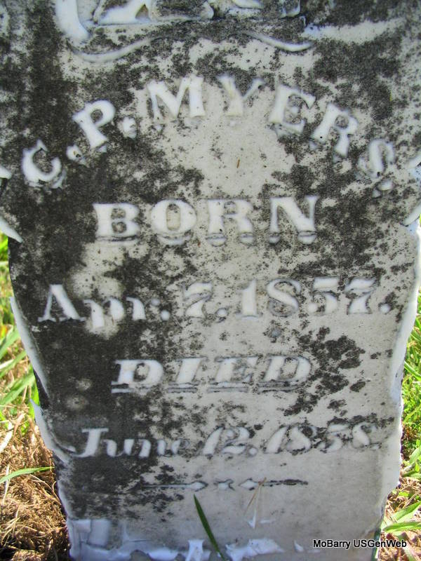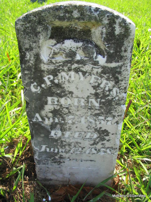| MYERS, Charles Phillip | Apr. 7, 1857 | June 12, 1858 | Research Note: Charles Phillip Myers was a son of Conrad and Hannah (Hedrick) Myers. Conrad and Hannah are buried in Fresno, CA. - Another Photo - Another Photo | Note Donna Cooper Photo Phyllis Long |