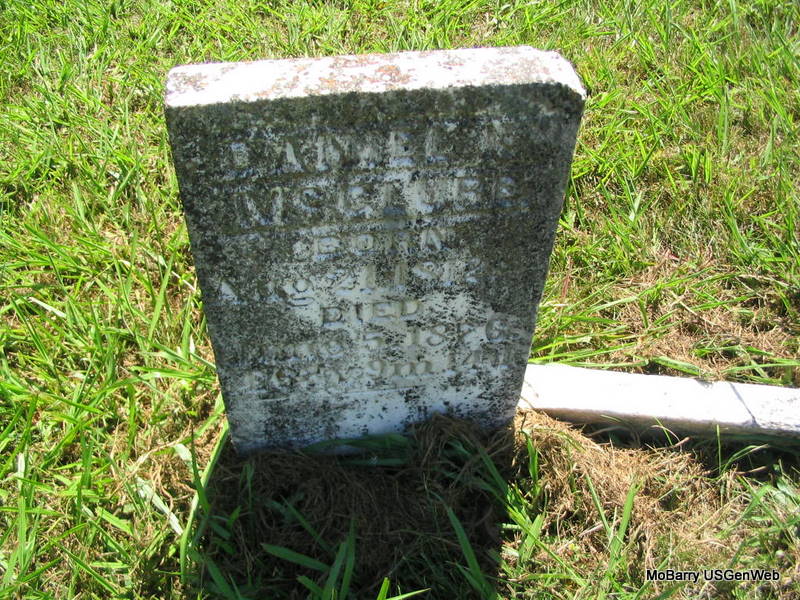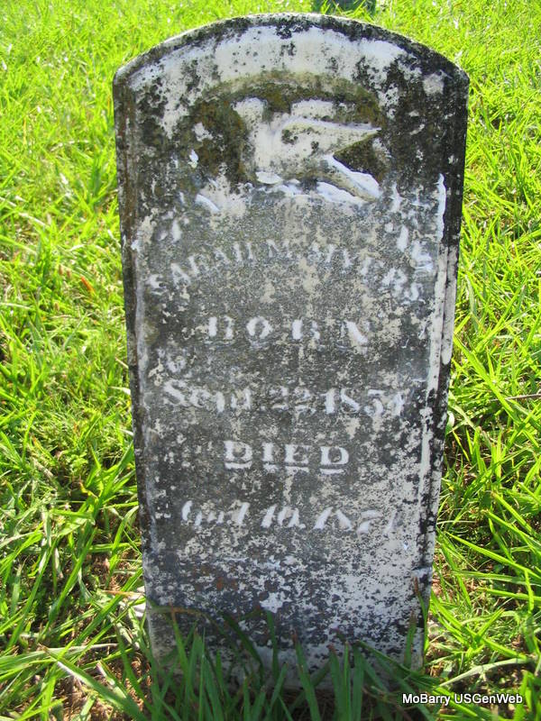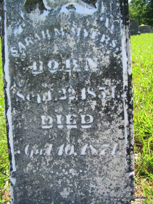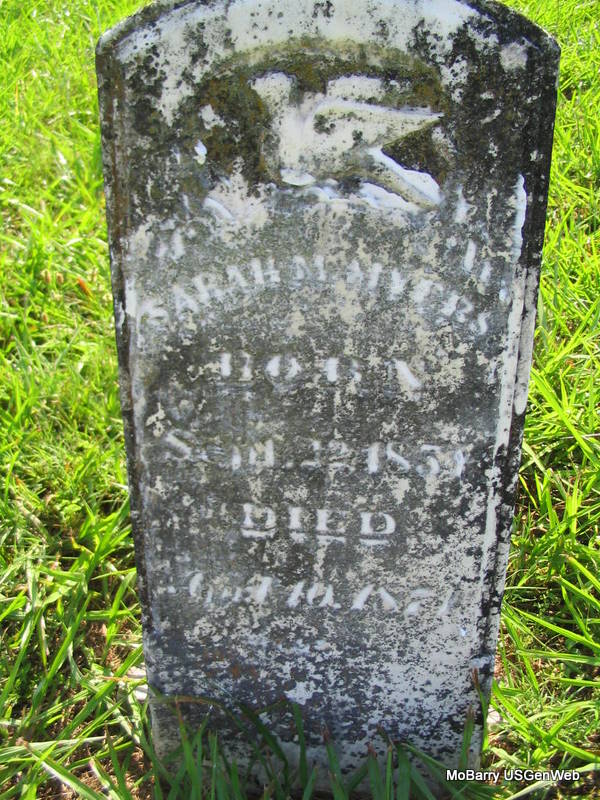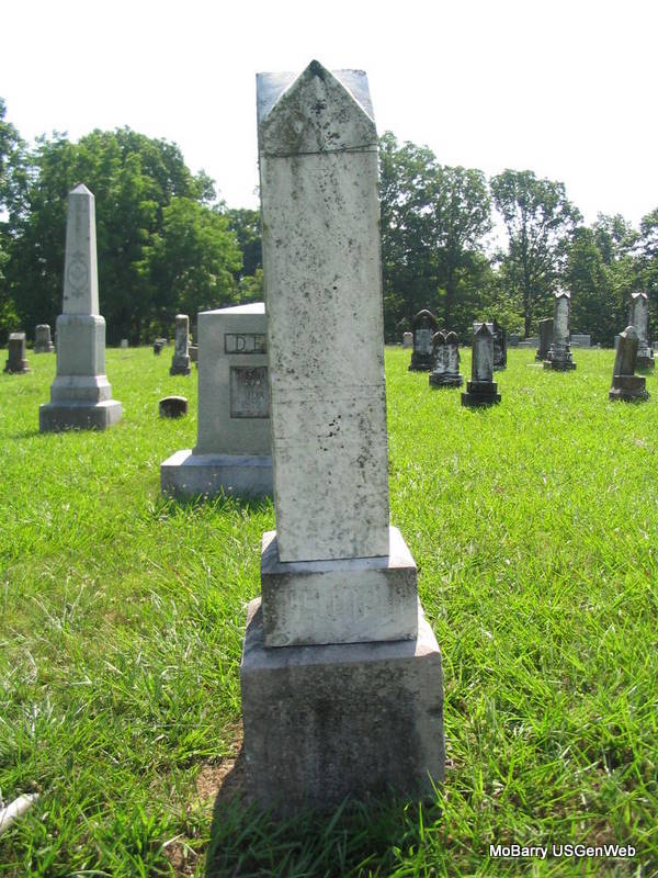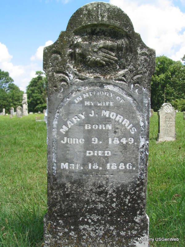 | MORRIS, Mary J. (FULTON) | June 9, 1849 | Mar. 18, 1886 | Inscription: "In Memory of My Wife" - Research Note: She was the wife of Bradley J. Morris. She married James Bradley Morris on Jan. 19, 1868 in Barry Co., MO. | Census MO Marriage Records Photo Phyllis Long |