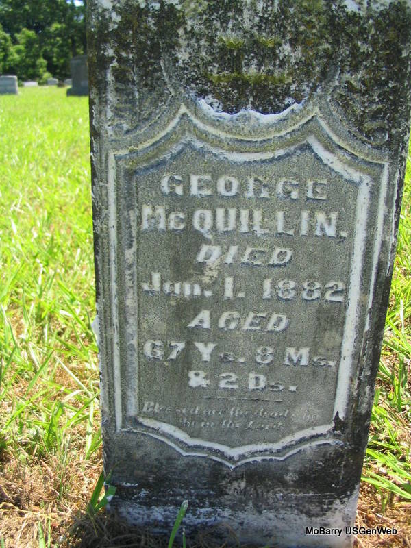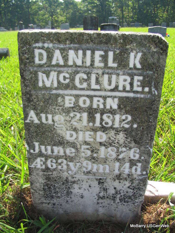 Inscription: "Ae 63y. 9m. 14d." - Research Note: He was the son of John Ewing McClure and Margaret Ann Kennedy. Daniel K. McClure married Abigail Henderson on Feb. 29, 1848 in Barry Co., MO. - Another Photo | MO Marriage Records Photos Phyllis Long |