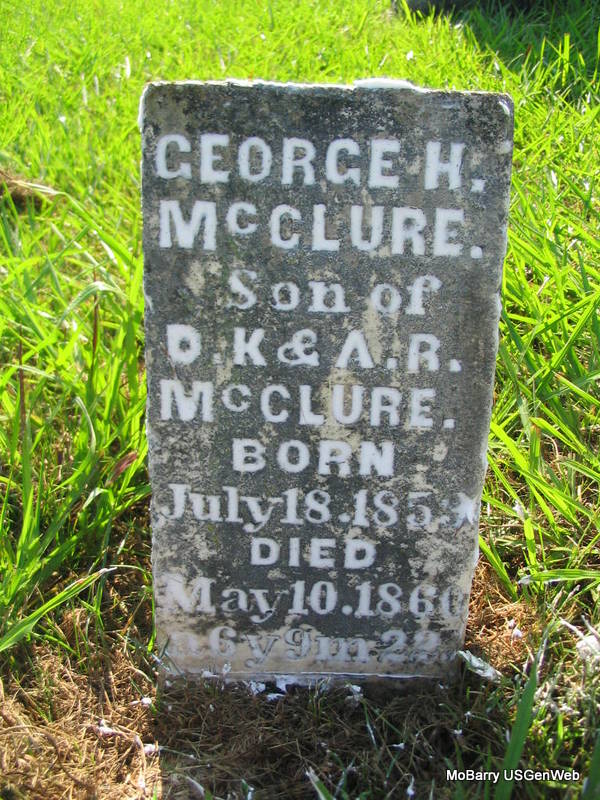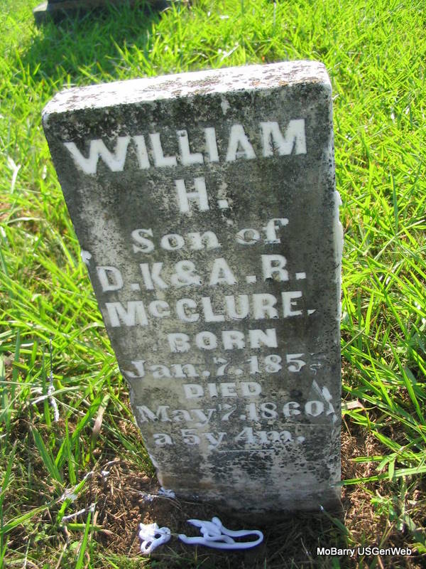 | MCCLURE, William H. | Jan. 7, 1853 | May 7, 1860 | Inscription: "Son of D. K. & A. R. - a 5 y. 4 m." - Research Note: He was the son of Daniel Kennedy McClure and Abigail Henderson. - Footstone | Photos Phyllis Long |