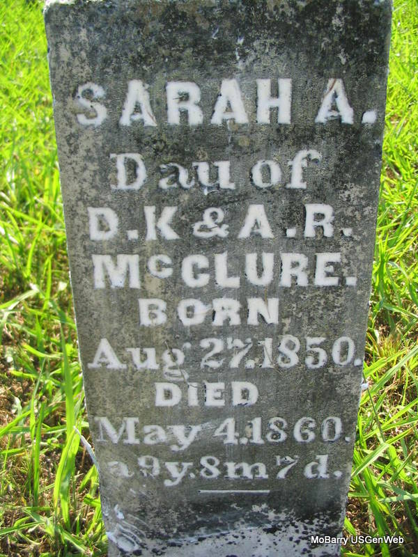 | MCCLURE, Sarah A. | Aug. 27, 1850 | May 4, 1860 | Inscription: "Dau. of D. K. & A. R. - a. 9 y. 8 m. 7 d." - Research Note: She was the daughter of Daniel Kennedy McClure and Abigail Henderson. - Footstone | Note Photos Phyllis Long |