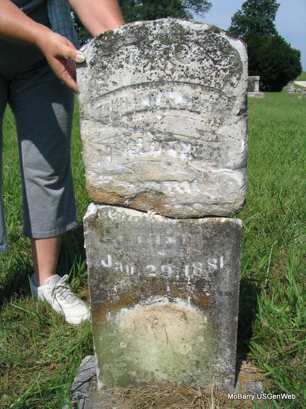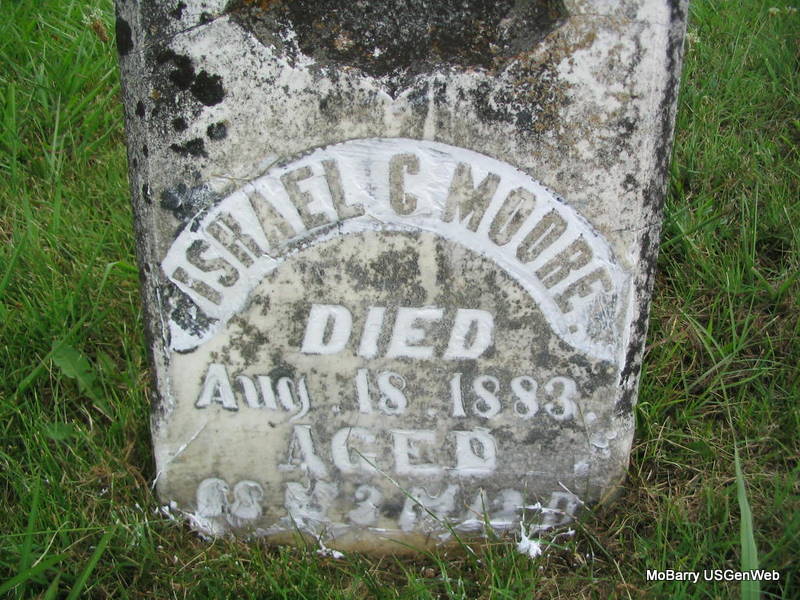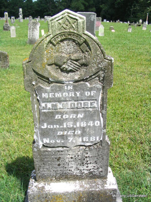 | MOORE, James Morris | Jan. 15, 1840 | Nov. 7, 1881 | Research Note: This stone is near the stones for Florence and Pearl Moore. Son of Alfred A. Moore and Elizabeth M. Capps. His wife was Mary Ann Johnson married on Dec. 22, 1870 in Barry Co., MO. - 1880 Census, Sugar Creek Twp., Barry Co., MO - James Moore, Self, Married, Male, White, 38, MO, Stock Dealer, NC, TN; Mary Moore, Wife, Married, Female, White, 28, MO, Keeping House, VA, TN; Anna W. Moore, Dau, S, Female, White, 7, MO, At Home, MO, MO; Cara E. Moore, Dau, S, Female, White, 5, MO, At Home, MO, MO; Nora Moore, Dau, S, Female, White, 4 Months, MO, At Home, MO, MO [Born March]; Malta Jesse, Other, S, Female, White, 12, MO, At Home, KY, KY [Martha?]. | Note Donna Cooper MO Marriage Records Census Photo Phyllis Long |