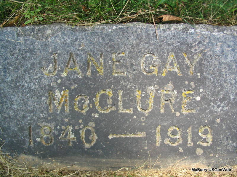 Research Note: She was the daughter of Daniel C. and Jane Gay and was the second wife of William McClure born 1819. They had children, Rebecca A., wife of Dr. S. W. Chandler; Alice E., wife of J. W. George; William D., John C., Guy W., and George W. Cassville Republican, Nov. 27, 1919 - Jane Gay McClure was a daughter of Mr. and Mrs. Daniel Gay, of the locality of Newtonia about the time of the organization of Newton county in the year 1839. Mrs. McClure was born February 12, 1840. Sometime later the family moved to Barry County and located in the vicinity of Washburn. She was married to William McClure in July 1861. Mr. McClure was engaged in the milling business at the Roaring River spring and was in the mercantile business at Washburn, then Keetsville and at Cassville and from 1866 to the early eighties the family lived at different times at each of these places. Later one of the fine Washburn Prairie farms on the old wire road near Washburn became the family home and remained so until Mr. McClure's death many years later. Mrs. McClure was the mother of six children: Mrs. Rebecca Chandler, wife of Dr. S.W. Chandler of this city; Alice George, deceased, wife of the late J. W. George, William D. of Claremore, Okla., Charles of Lawton, Okla., Guy W. of Springfield and R. White McClure, deceased of Springfield. - Another Stone | Goodspeed's History Online Obit Photos Phyllis Long |
