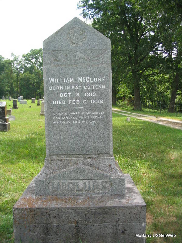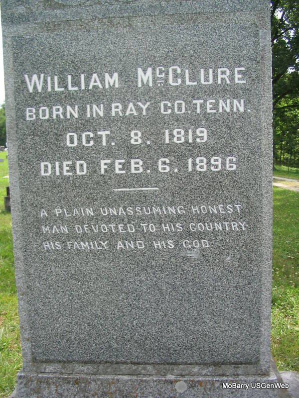 Inscription: "Born Ray Co., Tenn." - Research Note: He was the son of John McClure and Margaret Kennedy. John and Margaret started for MO in 1835 but he died in Louisburg, AR of cholera. William's mother brought the family on to Barry Co. and settled there. When William married, he went into business with J. T. Keet at Washburn. In 1850 he sold his half interest to J. T. and started his own mercantile business and continued until 1860 when he was elected county sheriff. At the beginning of the Civil War he was engaged in buying and driving horses to Louisiana but was compelled to quit the business at a heavy loss. He then moved to Roaring River and ran the mill there until 1880 when he returned to his farm in Washburn. His first wife was Sarah P. Tennant of Washington Co., AR, born 1825 in Hempstead Co., AR and she died on July 26, 1860. In July 1861, he married Zarilda Jane Gay. - Another Photo | Goodspeed's History Photos Phyllis Long |