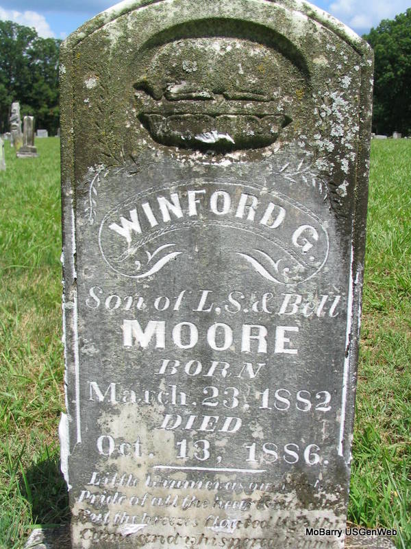 | MOORE, Winford G. | Mar. 23, 1882 | Oct. 13, 1886 | Inscription: "Son of L. S. & Bell" | Photo Phyllis Long |