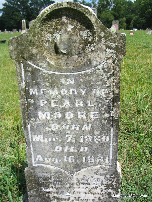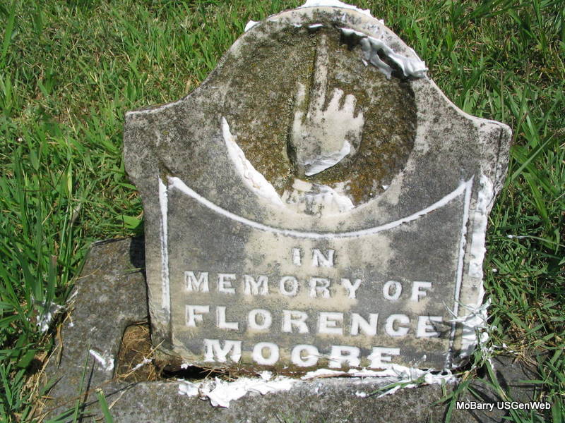 | MOORE, Pearl | Mar. 7, 1880 | Aug. 16, 1881 | Research Note: This stone is next to a piece of a stone that is left for Florence Moore. | Headstone Donna Cooper Photo Phyllis Long |