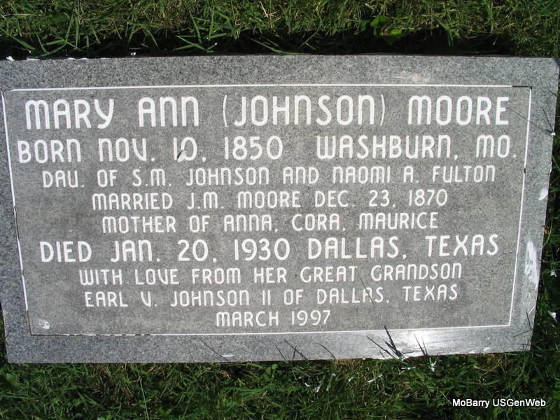 Inscription: "Born Nov. 10, 1850, Washburn, MO" - Research Note: Dau. of Seaborn M. Johnson and Naomi A. Fulton. Married James M. Moore Dec. 23, 1870. Mother of Anna, Cora, Maurice. Died Jan. 20, 1930, Dallas, Texas. With love from her great grandson Earl V. Johnson II of Dallas, Texas, March 1997. At age 52 she second married Charles W. Henderson, age 61, on Nov. 29, 1906 in Miller Co., AR. - Research Note: February 4, 1897, Cassville Republican, Barry Co., MO - Washburn News Items: The body of Mrs. Anna Johnson was brought up Monday eve on the 4:30 train for interment. She was taken to the residence of her daughter, Mrs. J. A. Frost, until Tuesday, where she was laid to rest by her husband's side in the Prairie cemetery. Mrs. Johnson was quite old and died of typhoid fever. Her daughter, Mrs. Mary Moore, who had been with her mother was also brought home quite low with typhoid fever, and her son, Arthur, was down with same unable to attend the funeral of his mother. | Online Newspapers TX Death Certificate MO Marriage Records AR Marriage Index Photo Phyllis Long |