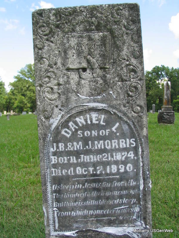 | MORRIS, Daniel L. | June 21, 1874 | Oct. 7, 1890 | Inscription: "Son of J. B. & M. J." - Research Note: Son of James Bradley Morris and Mary J. Fulton. - Another Photo | Photo Phyllis Long |