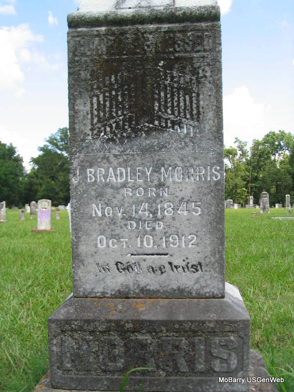 Research Note: Son of Robert Morris. He married Mary J. Fulton on Jan. 19, 1868 in Barry Co., MO. - October 17, 1912, Thursday, Cassville Republican - Washburn News: The remains of Bradley Morris of Fayetteville, Ark., was brought here for burial at Washburn Prairie Wednesday. He died at the hospital at Fayetteville. He will be remembered by the old settlers as the son of the late Rev. Robt. Morris. - Bradley N. Morris, formerly a Barry County citizen, died at his home near Springdale, Ark., last week. He lived some years ago on what is known as the Ernest Carter farm on Washburn Prairie. His father was a well known Baptist minister of this county. Mr. Morris had many relatives and old friends on Washburn Prairie who were grieved to know of his death. He leaves a wife and a number of other relatives to mourn his death. | Online Newspaper Donna Cooper MO Marriage Records Photo Phyllis Long |