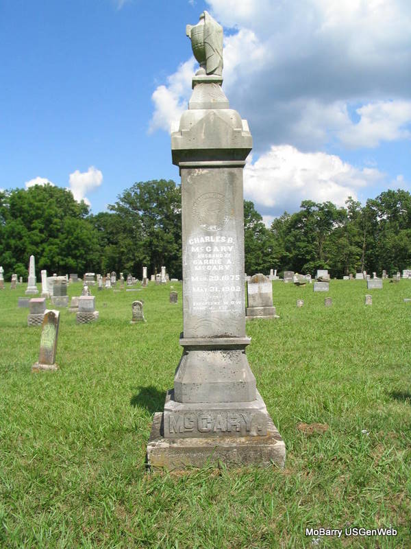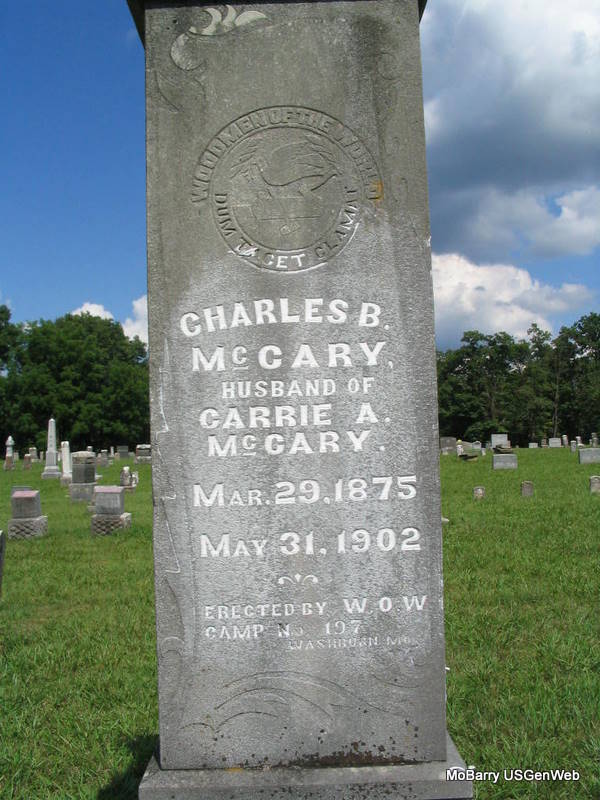 Inscription: "Husband of Carrie A." - Research Note: His father was Benjamin Franklin McCary and his mother Tennessee Peevey. Charles B. McCary age 25 married Carrie A. Windes age 25 on Dec. 25, 1900. - Another Photo | Note Donna Cooper MO Marriage Records Photo Phyllis Long |