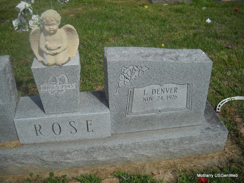 SSW: Dorris E. - Inscription: "May 5, 1945" - Research Note: Son of Lemma Lester Rose and Ola Pippin. He married Dorris Elaine Watson on May 5, 1945 in Cassville, Barry Co., MO. Surviving are two children, 2 sisters, six grandchildren and five great grandchildren. Preceding him in death were his parents; one son, Larry Rose; six brothers and four sisters. Denver grew up and received his education at Washburn where he graduated from high school. For thirty-five years he was a truck driver, driving for Forest Products, Crystal Springs Farms, Purina and in 1989 retired from Efco. Prior to moving to Seligman he had resided in Cassville around fifty years. He was a member of Seligman First Baptist Church. After his retirement he enjoyed sitting on his porch and watching the birds. - Another Photo - Another Photo | Fohn Funeral Home Photo Phyllis Long Photos Donna Cooper |