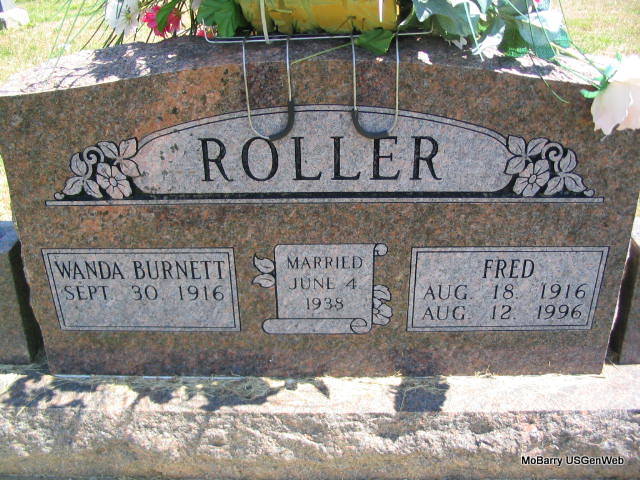 SSW: Fred - Inscription: "Married June 4, 1938"- Research Note: Wanda married Fred Roller. She was a daughter of Andrew Amos and Martha Florence (Weathers) Burnett and descends from Zachariah Haddock descendant. Phyllis' Note: She was a Washburn resident. She was a daughter of Andrew Amos Burnette and Martha (Weathers) Burnette. She married Fred Roller at Mount Vernon, Missouri on June 4, 1938, he preceded her in death August 12, 1996. In addition to her husband and her parents, she was preceded in death by one son, Jimmy Dale Roller, and 4 brothers; Lonnie Burnette, Frank Burnette, Harry Ottis "Curly" Burnette, Allen "Brook" Burnette; two sisters, Verna Sparks and Betty Johnson. | Note Donna Cooper Obit White Funeral Home Photo Phyllis Long |