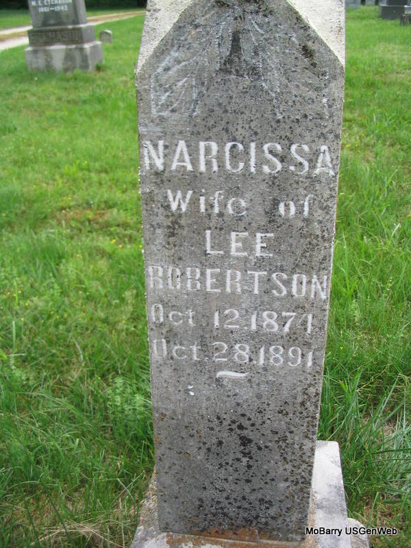 | ROBERTSON, Narcissa Nancy (PAUL) | Oct. 12, 1874 | Oct. 28, 1891 | Inscription: "Wife of Lee Robertson" - Research Note: Daughter of Joseph Thomas Paul and Orpha Elvira Ross. At age 17, she married Robert E. Lee Robertson, age 36, on Jan. 25, 1891 in Barry Co., MO. | MO Marriage Records Census Photo Phyllis Long |