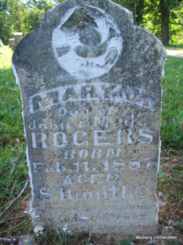 | ROGERS, Mary J. | 1886 | Feb. 11, 1887 | Inscription: "Age 8 mos. - Dau. of John & M. J." | Photo Phyllis Long |