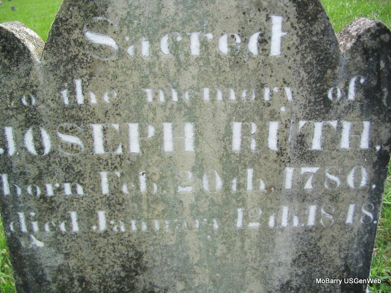 Research Note: Joseph Routh is incorrectly listed as Ruth Joseph on Gerald Haddock's cemetery transcription work and in Vol. 2, p. 67 of the cemetery book. The stone also reads Ruth as his surname. He was the son of Jacob Routh Sr. and Martha Redfern. Joseph Routh married Elizabeth Murrell in 1784 in Hawkins Co., TN, and married Margaret Lillard second. Elizabeth died in Monroe Co., TN. Barry County Letters of Adm. - Pages 159 - 161: Joseph Routh: Died with a will. John R. Routh, Joseph Dougherty, executors. Heirs: Margaret Routh, Pleasant M. Routh, May Hagen, Zezy Routh, Benjamin M. Routh, Nancy Lilland, William J. Routh and John R. Routh. - According to Goodspeed's History Joseph Routh was a justice of the peace in 1846. Nancy Routh married William Lillard. | Letter of Adm. Wills Census Marriages Goodspeed Robert Fletcher Genealogy Donna Cooper Photo Phyllis Long |