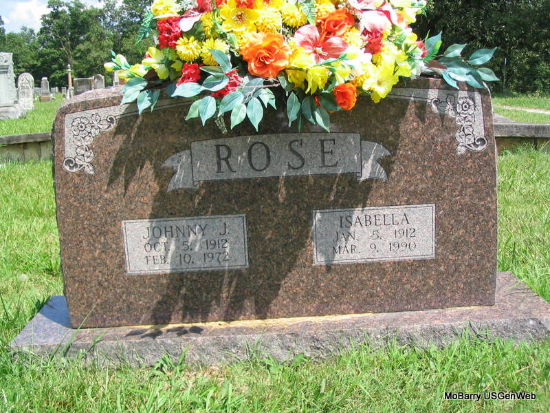 SSW: Isabella - Research Note: Culver Funeral Home records state that Johnny Rose was a son of Sam Rose and Nancy Bowman. Isabella Cargile Rose was his wife's name and he's lived all his life in Barry Co., MO. He was age 59 and was a logger. Phyllis' Note: Johnny Rose was a logger and died in the woods in a logging accident. His wife Isabelle lived until 1990. They had 8 children. | Culver Funeral Home, V. 15, p. 8, by Ted Roller Donna Cooper Note Photo Phyllis Long |