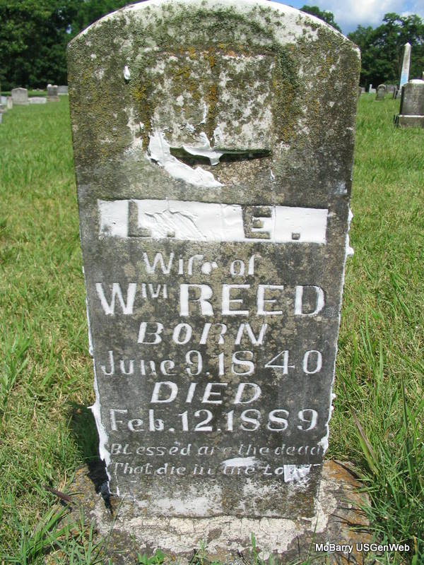 Feb. 12, 1889 | Inscription: "Wife of Wm. Reed" - Research Note: She was the daughter of Darby Kelly Elkins and Lydia Eveline Adkins. - 1850 Census, Virginia, Wayne, District 66 - Darby Kelly Elkins, age 40, born VA; Lydia, age 40, born VA; Furibin, age 20, born VA; Clarisa, age 18, born VA; Kelly, age 15, born VA; Jacob, age 13, born VA; Nancy E., age 11, born VA; Lucinda, age 10, born VA; Phoebe, age 7, born VA; Louisa, age 6, born VA; Leander, age 4, born VA, Charles D., age 1, born VA. - In 1860, Darby has died and the family is in Crawford Co., AR. - William K. Reed, son of Samuel K. Reed and Mary Ann Burnett, was born on Jan. 18, 1840 in Roane Co, TN. He died on Aug. 8, 1892 in Marionville, Lawrence Co, MO. The cause of death was brain & spinal disease, progressive paralysis. He was buried in Charity (Bradfield) Cemetery. He married Lucinda Evelyn Elkins in Crawford Co, AR. They had children, Mary Evelyn, Leah, Ellazora, Emiline, and Samuel. - 1890 Special Veteran Census William Reed 1st Ark Cavalry with a crippled thumb shows in Washburn Township of Barry County, MO. | Census Photo Phyllis Long |