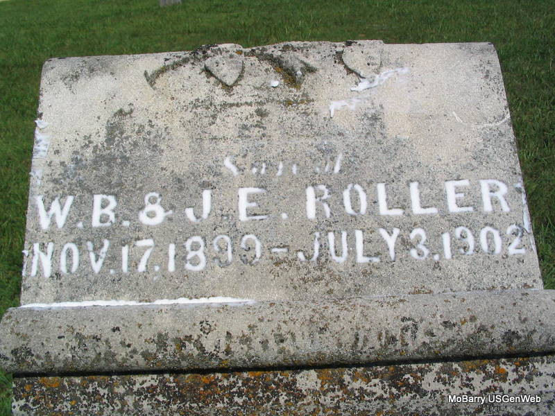 | ROLLER, Leon | Nov. 17, 1899 | July 3, 1902 | Inscription: "Son of W. B. & J. E. Roller" - Research Note: Son of Windord Burl Roller and Jennie Elizabeth Park. Large, ornate, upright stone, inscribed: Son of W. B. & J. E. Roller. Couldn't read inscription on the scroll. - Another Photo - Another Photo | Headstone Betty Fountain Erickson Photos Census Phyllis Long |