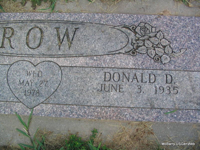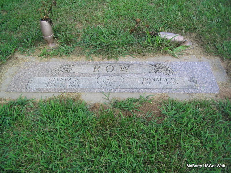 SSW: Glenda J. - Inscription: "Married May 27, 1978" - Research Note: He was the son of Frank and Maureen (Green) Row. He worked his way up in the Caterpillar Company in Peoria, Illinois, for 24 years before retiring as a buyer for the company. In 1978 he moved to Grandview, Missouri, then after visiting the lake he moved to Barry County where he owned and operated R and W Machine Shop in Cassville. On October 17, 1997, he was united in marriage to Maureen McCoy in Las Vegas, Nevada. He was a self made business entrepreneur, successfully studying and investing in the stock market. He loved to spend his time ranching and gardening. He had a gruff exterior, but a generous heart. In addition to his parents, he was preceded in death by one son, Donald "Donnie" A. Row; one step-son, Mark Barron; three brothers, Bob, Dick, and Bill Row; three sisters, Carolyn Perardi, Rosalee Painter, and Jean Brewer. - Another Photo - Old Stone | White Funeral Home Photos Phyllis Long |