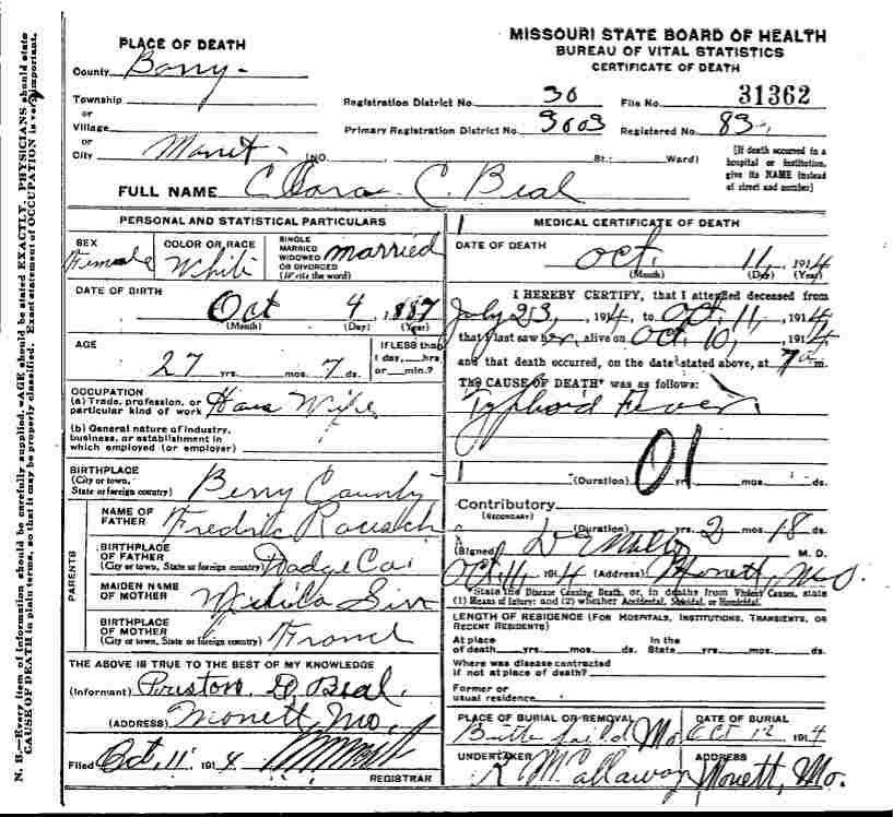 | Text | ARTICLE #1 - Butterfield News: We are sorry to here [hear] of the death of Clara Beal who passed away at her home in Monett Sunday morning after several weeks illness. Interment was made in the Russell Cemetery. We extend our sympathy to the bereaved family. ARTICLE #2 - Shady Grove News: Mrs. Preston Beal died at Monett last Sunday after a lingering illness of stomach trouble. Her body was laid to rest Monday evening at the Russell Cemetery following funeral services conducted by J. W. Ennes at the home of her father, Fred Rausch. Article #3 - Clara C. Beal, wife of P.D. Beal, died at her home on Marshall Hill, Sunday after an illness of eleven weeks. The remains were taken to the home of her parents, Mr. and Mrs. Fred Rausch two miles south of Butterfield, and the funeral was held Monday. She was twenty-seven years old. Research Notes: Born: 4 Oct. 1887, Butterfield, Barry Co. MO, Died: 11 Oct. 1914 Monett, Barry Co MO, Married Preston D. Beal 11 May 1919 Cassville, Barry Co MO. Parents: Frederick and Julia Ana Rausch |