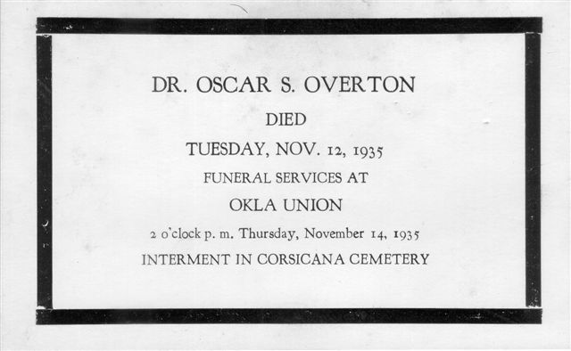 | Data | Died Tuesday, Nov. 12, 1935, Services Okla Union, Nov. 14, 1935 Internment Corsicana Cemetery |