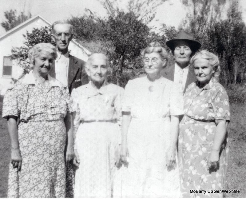 James Harvey Mooney Family Pictured are Jamie Mooney, Ella (Pease) Mooney, Janetta (Fetrow) Pease, Estella "Stella" (Pease) Woodruff, Ernest Lund andMinnie (Pease) Lund. Sam Woodruff died in 1949, the husband of Stella. Jamie Mooney died in 1952 so this photo was taken between 1949 and 1952. [Fields Photo, Cassville, MO] Submitted by: Donna Cooper Loyd Patrick & Ruth (Berryhill) Mooney - Submitted by: Donna Cooper |