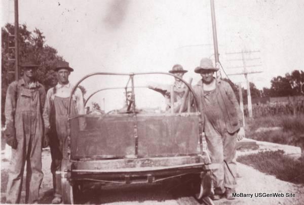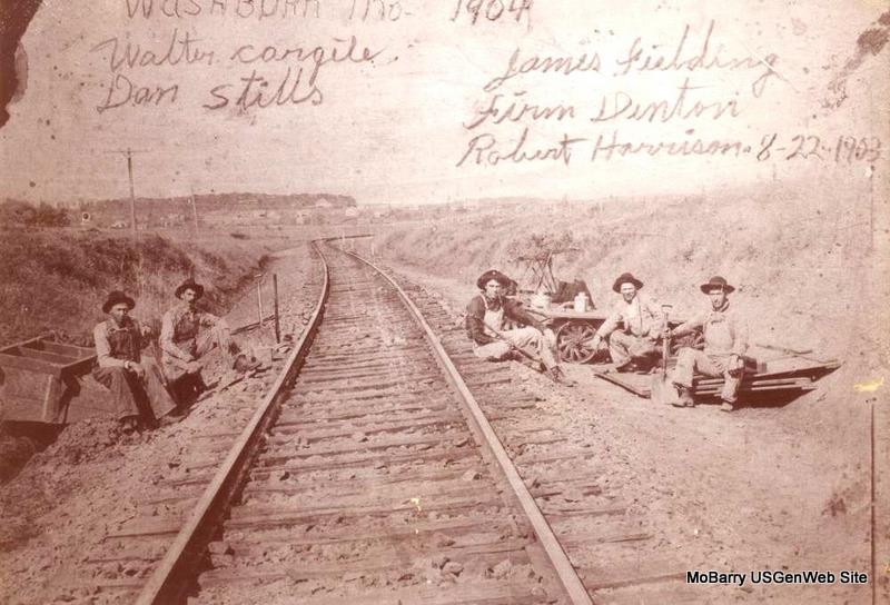 Working on the Railroad The men are Walter Cargile, Don Stills, James Fielding, Firm Denton and Robert Harrison. Robert Harrison was the son of Robert Austin and Louisa Baker Harrison. Louisa Baker Harrison married 2nd time to James Thomas Cargile and is buried in the Cargile Cemetery in Washburn, MO. Submitted by: George E. Miller, Webbers Falls Historical Society, Webbers Falls, OK Railroad Workers - Robert Hurley Harrison, 2nd on left Submitted by: George E. Miller of Webbers Falls Historical Society, Webbers Falls, OK |