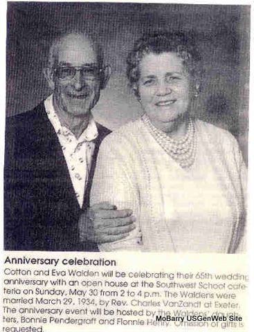 Abe, Frank, Jonsie, Elvis and Cotton Walden - Submitted by: Linda D. Garrett Bonnie (Walden) Pendergraft - Submitted by: Linda D. Garrett Cotton Walden - Citizen of the Year - Submitted by: Linda D. Garrett Cotton and Eva Walden's First Home - Submitted by: Linda D. Garrett Cotton and Eva Walden's Anniversary Photo - Submitted by: Linda D. Garrett Walden, Solly Ann (Wyrick) - Submitted by: Linda D. Garrett Eva Walden's Obituary Clipping - Submitted by: Linda D. Garrett Walden Family - Submitted by: Linda D. Garrett Walden Family - Submitted by: Linda D. Garrett October 1949 - children of James and Laura (Young) Walden back row: Everett Harry "Johnsie", Franklin Delano "Frank", Clovie Abe "Abe", Elvis, and Albert Forest "Cotton" front row: Mary Alene "Pat", Norma Lee "Sue", Betty Jo "Betty", and Thelma Deloris "Thelma" Laura Belle (Young) Walden - Submitted by: Linda D. Garrett |