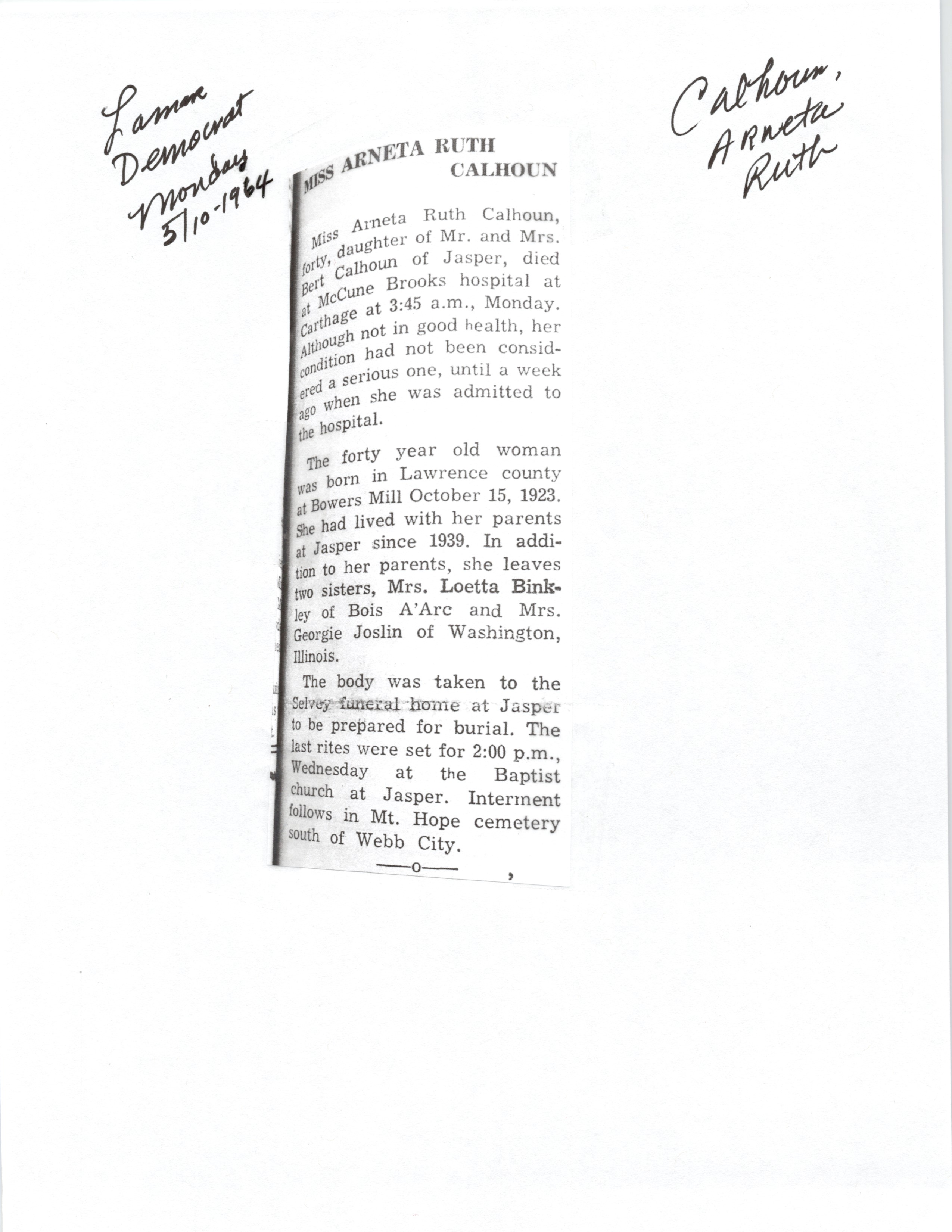 Calhoun, Aneta Ruth