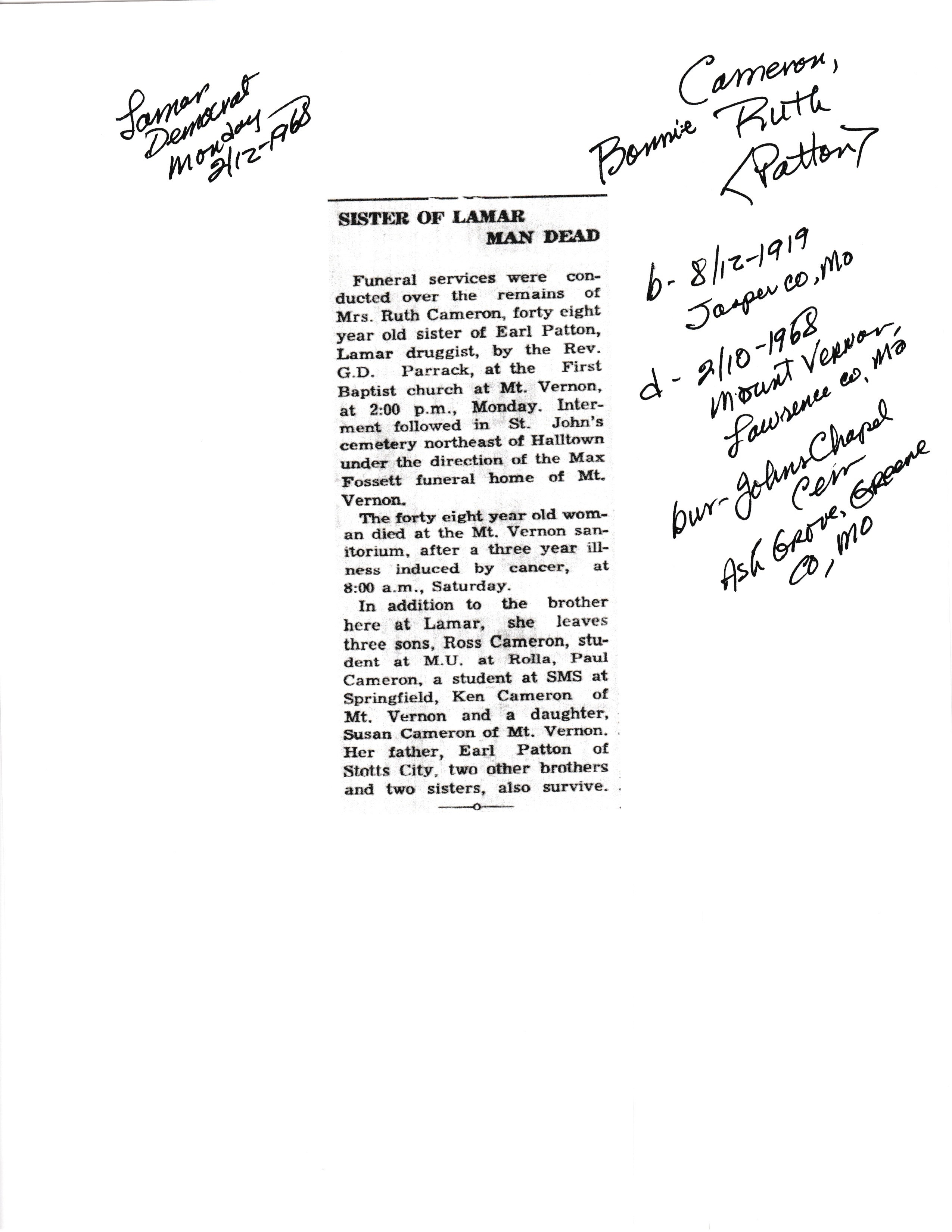 Cameron, Bonnie Ruth
