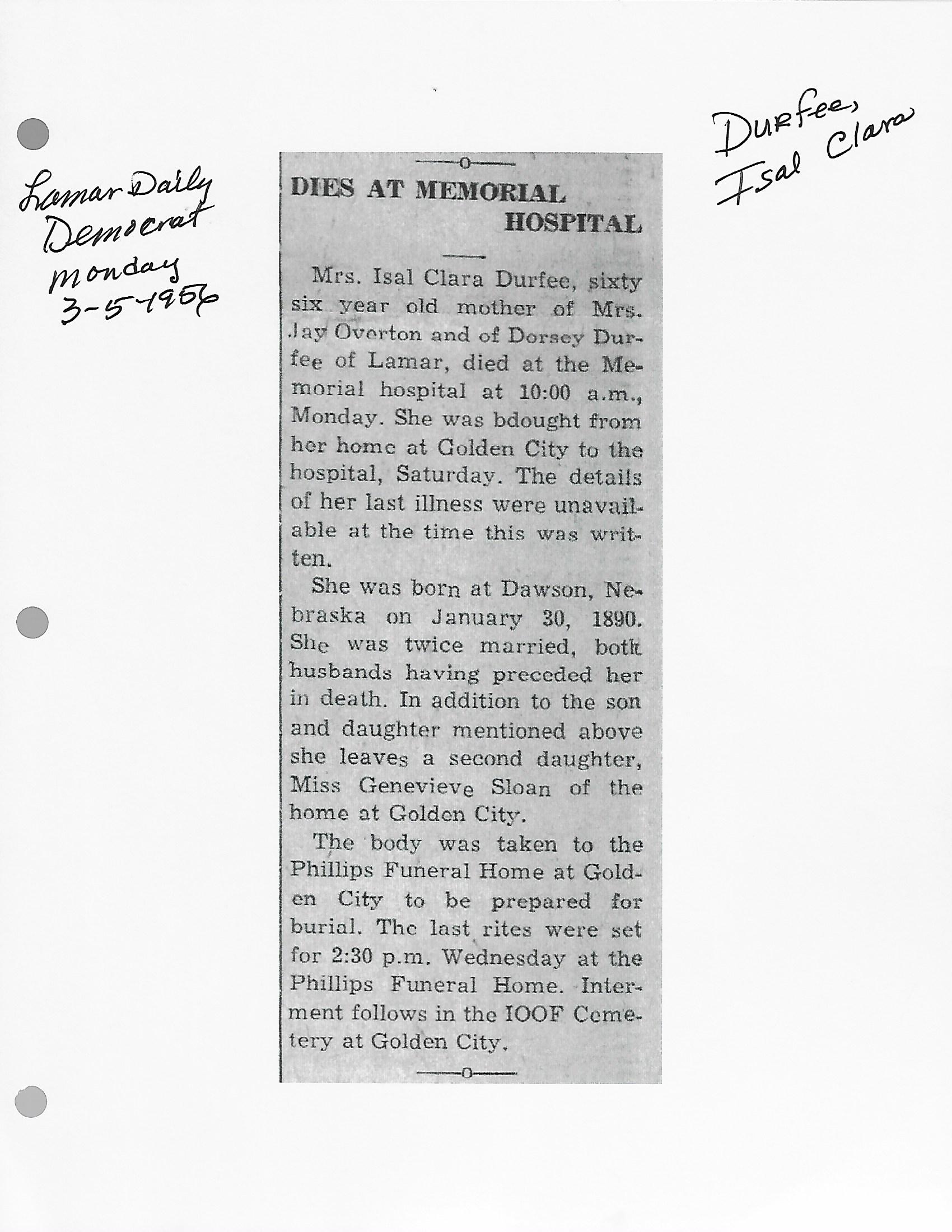 Durfee, Isal Clara