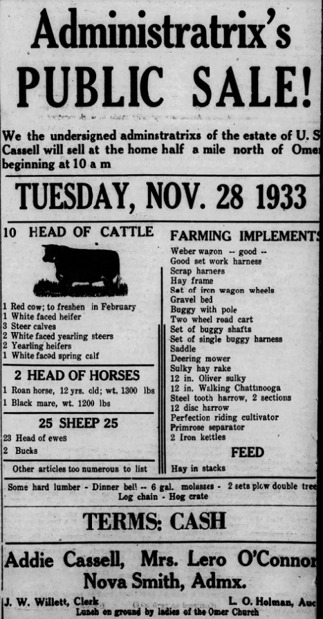 Ulysses Stephen Grant Cassell was born in Wytheville, Va., October 6, 1865, moved to Cedar County, Missouri, with his parents as a child, and departed this life Nov. 7, 1933, at the age of 68 years, 1 month and 1 day. Death was from heart failure and came entirely without warning in the store at Omer near his home.
