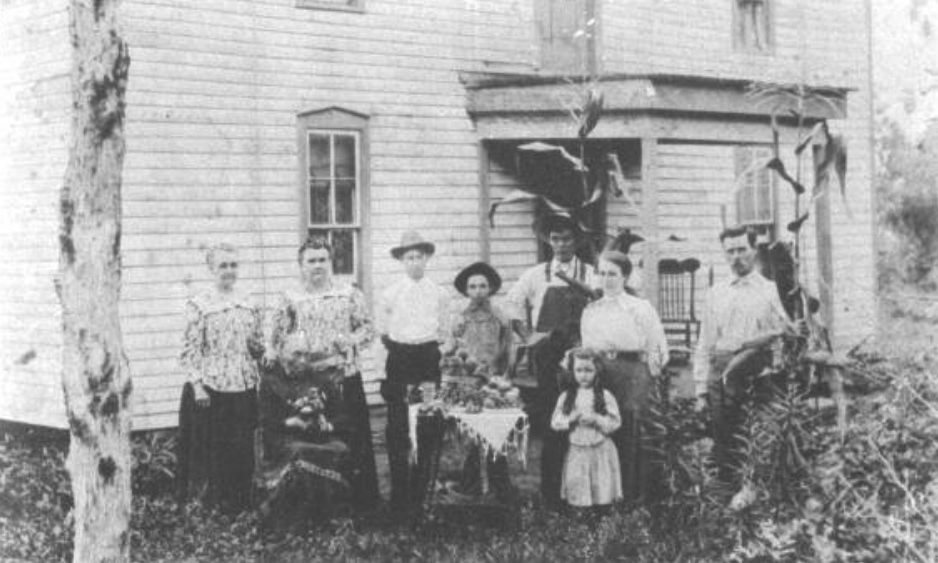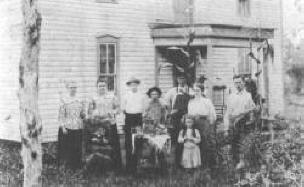 This picture was taken in Linn Township about 1909 - 1910. Standing left to right: Cordelia Crawford Whiteside and Fidenia Crawford Fillpot (daughters of John Newport Crawford and Keziah Julian Crawford), Rowland Fillpot (son of Fidenia and Jim Fillpot), William Crawford (son of John A. Crawford), Charles Franzo Fillpot and Beatrice Fillpot (children of Fidenia and Jim Fillpot), John A. Crawford (holding corn stalk on the right, son of Keziah and John Crawford). Seated in front of her daughters is Keziah Julian Crawford (age 83). Standing in front of Beatrice Fillpot is Fannie Crawford (daughter of John A. Crawford).