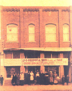 J.E. Fillpot & Son store was located in El Dorado Springs in the early part of the 20th century. The family moved to Oklahoma (about 1929) J.E. Fillpot was Sheriff of Cedar County in 1901 & 1902. He went by the name Jim. The only people we can positively identify in this picture are in the center and to the right side of the doors. First is Minnie Miller Fillpot (daughter of William B. and Orlena Foust Miller), Franzo Fillpot her husband (and son of Jim Fillpot), Fidenia Crawford Fillpot (wife of Jim Fillpot). We believe Jim is the one standing in the door. Would love for someone to recognize the building and tell us where it is (or was).