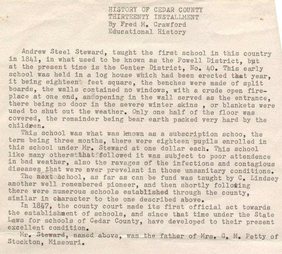 History of schools in Cedar County, Missouri by Fred M. Crawford.