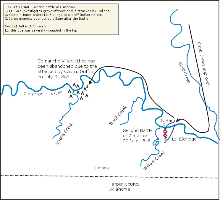 Captain Jones arrived on the banks of the Cimarron just east of where the First Battle of Cimarron had occurred on the morning of July 20th 1848. Jones had 108 men and officers under his command, sixty-seven from Company B under First Lieutenant Joseph C. Eldridge, sixteen men from Company A under Lieutenant Bain and fifteen men of artillery from Company C, and seven civilian and scouts, including the Indian guide Micheau Duvall.