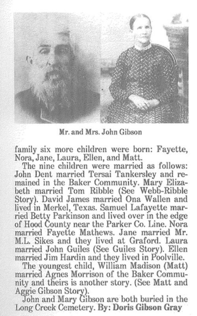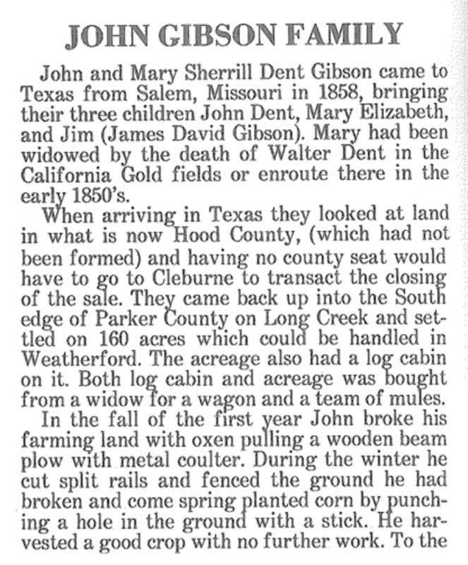 John Gibson FamilyNote from Submitter: Fred Gibson Here is a nice article and photo of John W. Gibson and Mary (Sherrill) Dent. If you run across any John W. Gibson (b. 1832) or James M. Gibson (B. 1834) information please give me a heads up. Their parents were James and Elizabeth Gibson from the S and N.Carolina. Fred Gibson Texas John and Mary Sherrill Dent Gibson came to Texas from Salem Missouri in 1858, bringing their three children John Dent, Mary Elizabeth, and Jim (James David Gibson). Mary had been widowed by the death of Walter Dent in the California Gold fields or enroute there in th early 1850's. When arriving in Texas they looked at land in what is now Hood County, (which had not been formed) and having no county seat would have to go to Cleburne to transact the closing of the sale. They came up into the South edge of Parker County on Long Creek and settled on 160 acres which could be handled in Weatherford. The acerage also had a log cabin on it. Both log cabin and acreage was bought from a widow for a wagon and a team of mules. In the fall of the first year John broke his farming