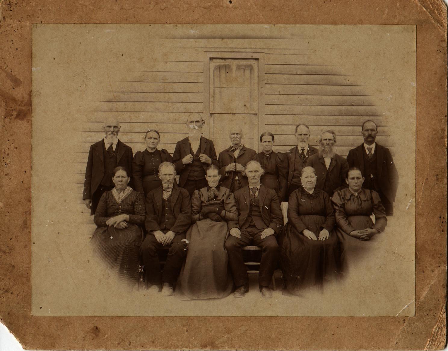 Plank Family![]() view full size image Photo from around 1880-1890's Jasper Plank b. 1847 d. 1918 in Salem, Missouri (sixth person on top row) Eliza Welch Plank b. 1845 d. 1908 Salem, Missouri (fifth person on top row) Members of Round Pond Church, Dent County, Missouri Can anyone help identify the other people in this photo? Are they Plank relatives or members of the Round Pond Church? Russ Waegelin |